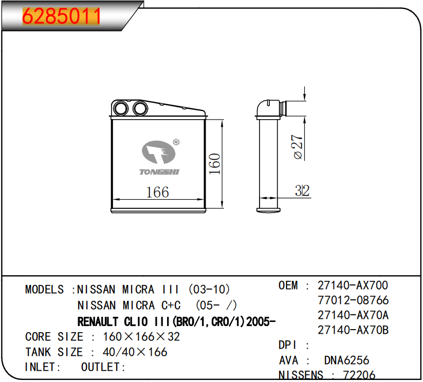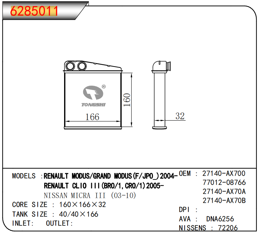 适用于 日产 MICRA III (03-10)  日产 MICRA C+C (05- /)/雷诺 CLIO III (BRO/1,CRO/1)2005-/雷诺 MODUS/GRAND MODUS (F/JPO)2004-  暖风