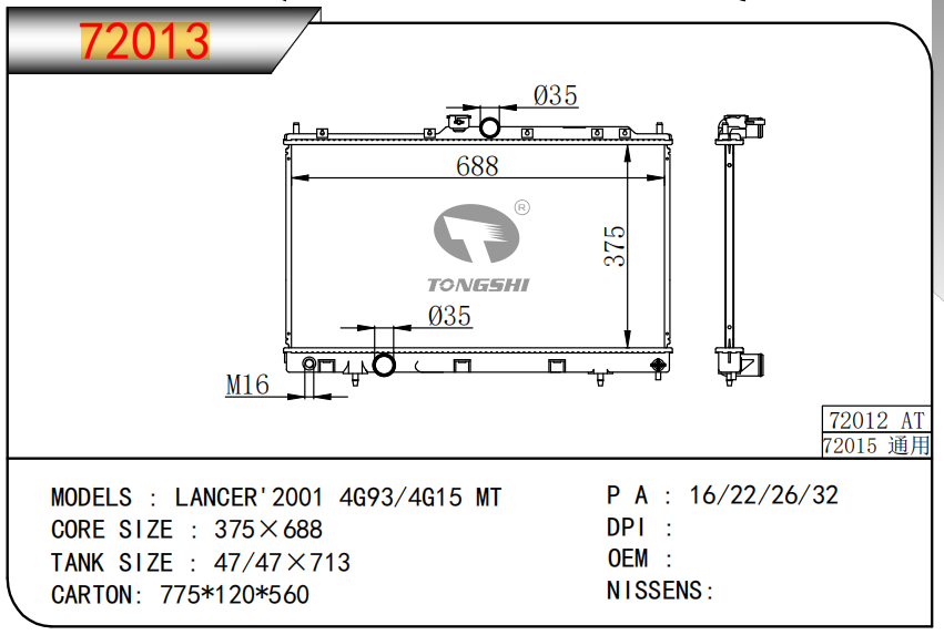 适用于FREIGHTLINER CASCADIA 125/ 113 L6 12.8L 12-13 AT散热器