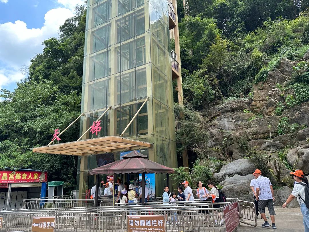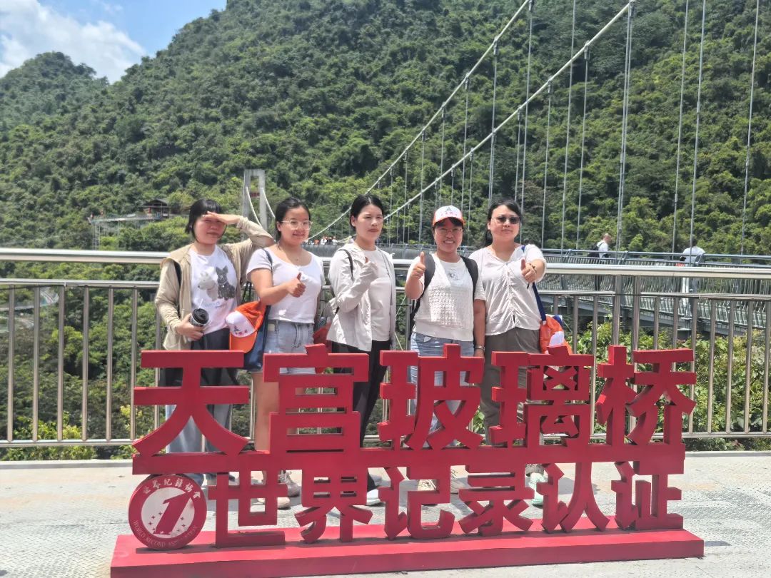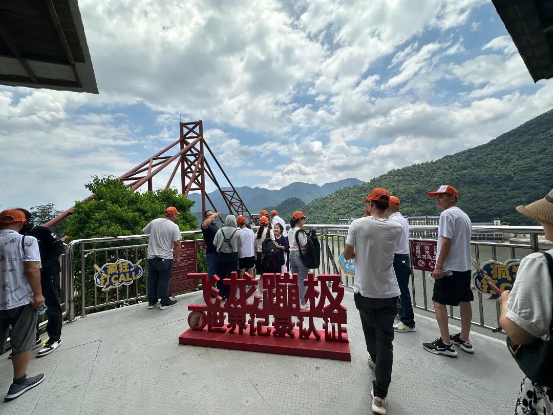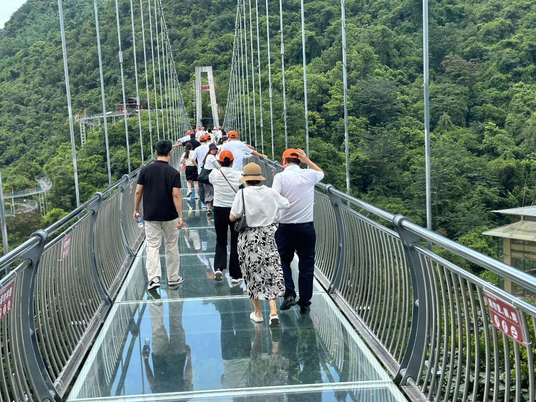 午后,团队抵达宝晶宫国际旅游度假区。在4A级景区内,大家乘坐垂直观光电梯直抵云霄,漫步于湖景玻璃桥上。